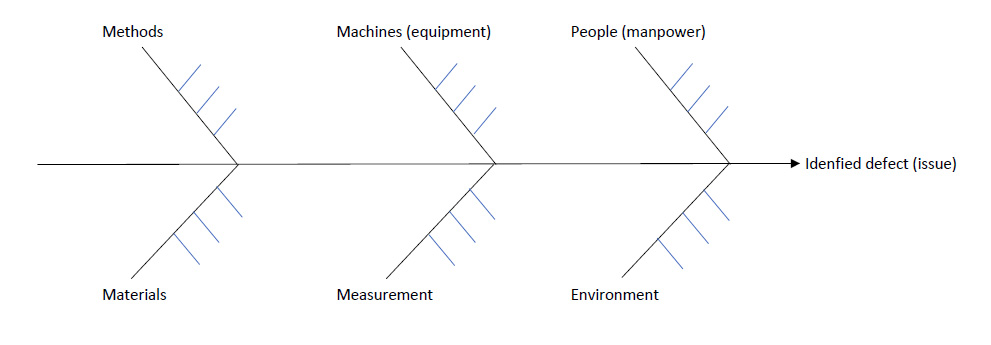 A cause and effect diagram, also known as a fishbone diagram or Ishikawa diagram, was developed bu Kaoru Ishikawa in 1943. This is a method for diagramming the flow of work in a way useful for determing the cause and effects of problems encountered. The "head" is the identified problem. The body shows potential causes and is categoriezed into major categories. The major categories typically utilized include: