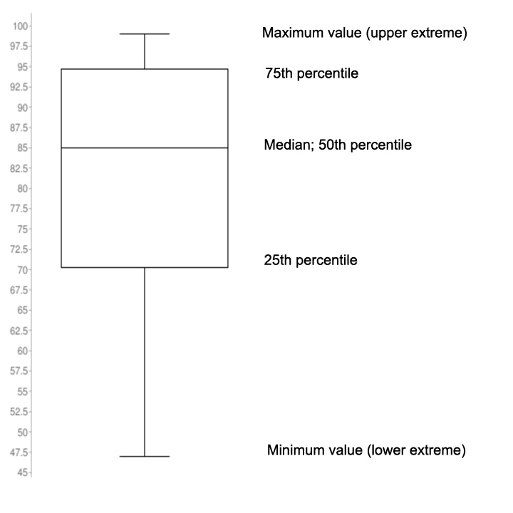 quartile, upper quartile, median, interquartile range, and whiskers. The minimum score is 46, maximum is 99,